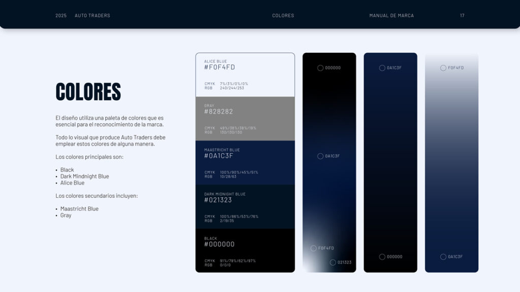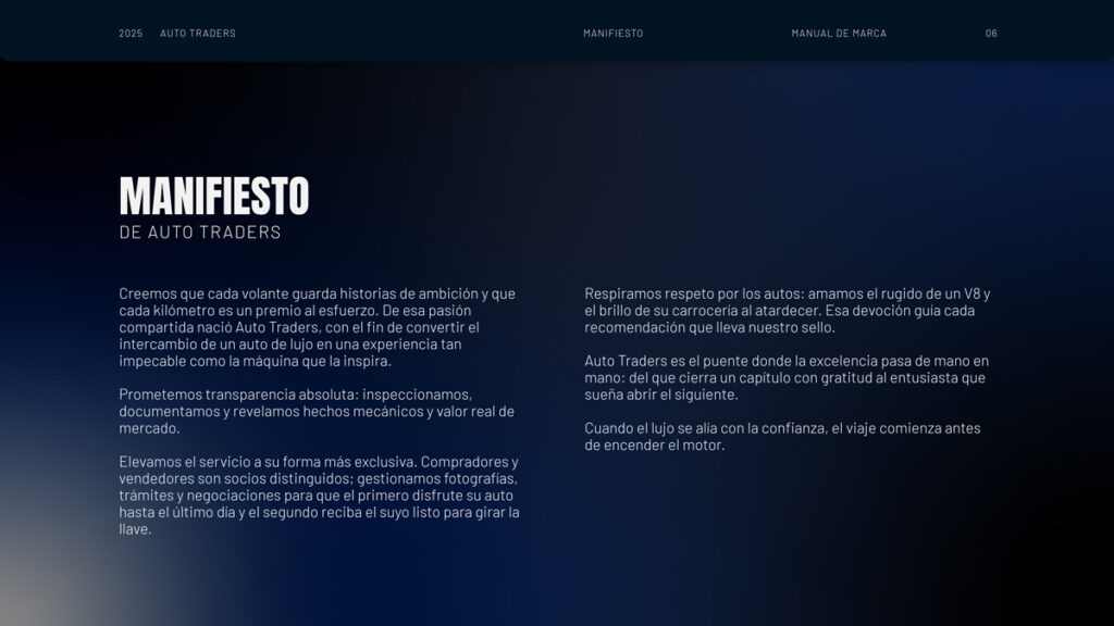 Para Auto Traders desarrollamos un branding enfocado en el lujo y la confianza, construyendo una narrativa donde cada auto cuenta una historia de esfuerzo y cada intercambio se vive como una experiencia exclusiva. Definimos tono, storytelling y sistema visual alrededor de la transparencia total, el respeto por los autos y el rol de Auto Traders como puente confiable entre vendedores exigentes y compradores entusiastas.
